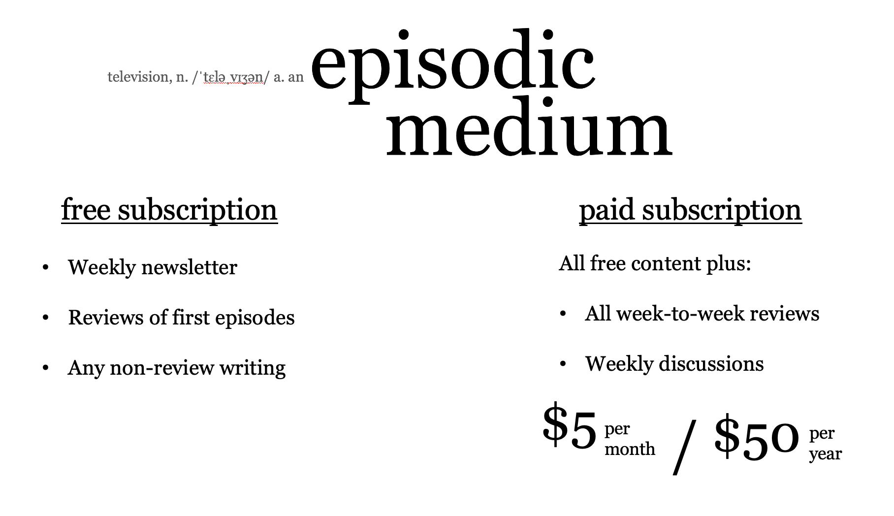 Here’s how the subscription model for Episodic Medium will work. Free subscribers will have access to the review of the first episode of a show I’m covering, giving you a taste of my relationship to a series, the style of my reviews, and the kind of conversation happening between subscribers. Additionally, free subscribers will have access to a weekly newsletter featuring brief reactions to things I’ve watched, links I’m interested in sharing, and highlighted emails/comments from the discussion of the shows I’m covering. I also expect that if I have more big-picture thoughts about a particular series, or a larger trend in television, that I will publish that here if it seems like it isn’t a fit for other outlets I’ve written for.
