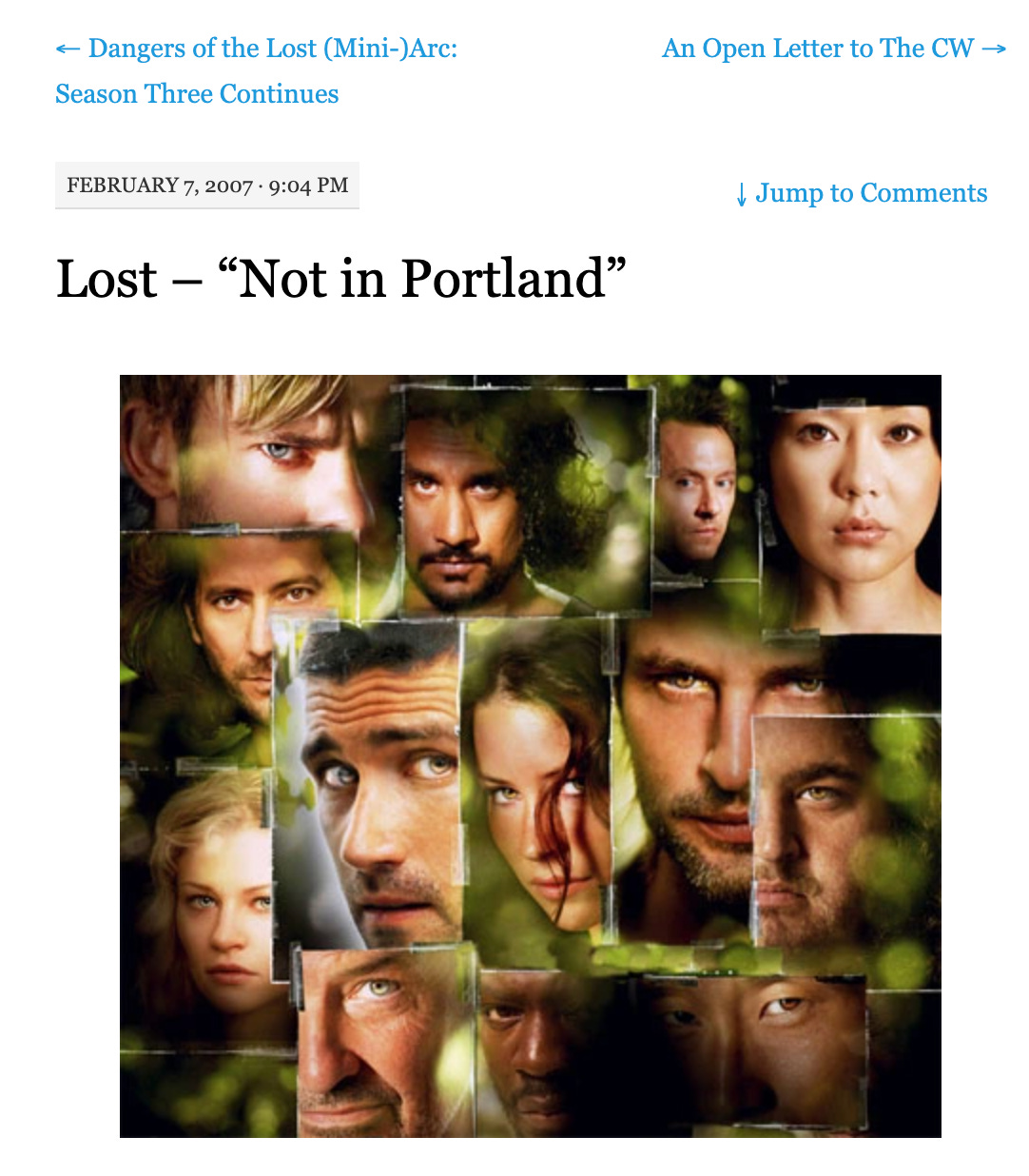 When I started my blog Cultural Learnings in 2007, I wrote about television because it was something I was passionate about, yes, but I also wrote about television because it was something that had such a clear, legible discourse online. When ABC’s Lost returned from a controversial mid-season hiatus to continue its third season fifteen years ago this month with “Not In Portland,” I wasn’t confused about how to write about it: through sites like Television Without Pity and the blogs of critics like Alan Sepinwall and Maureen Ryan, I knew that the internet was interested in a somewhat pithily written recap of events of each episode combined with some level of critical analysis.