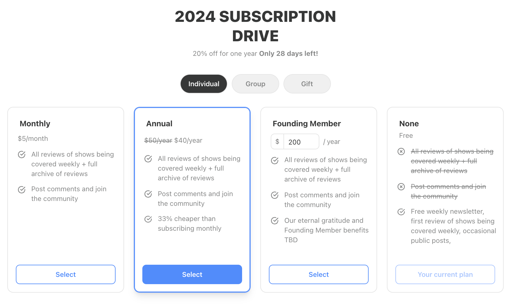 I’ve been going back and forth about comparing our yearly subscriber push to a public television pledge drive. We aren’t a non-profit, exactly, and to position television criticism as public service is overstating our importance to the social fabric. However, the “pledge drive” logic applies for me in this case because as a writer-owned and reader-supported newsletter, what we’re really asking for you to do during this period is invest in our mission. I want you to think of this as more than buying access to reviews because it is more than just producing content to me. It’s about supporting our writers, strengthening the community of television criticism, and building something that can keep doing that for a long time.