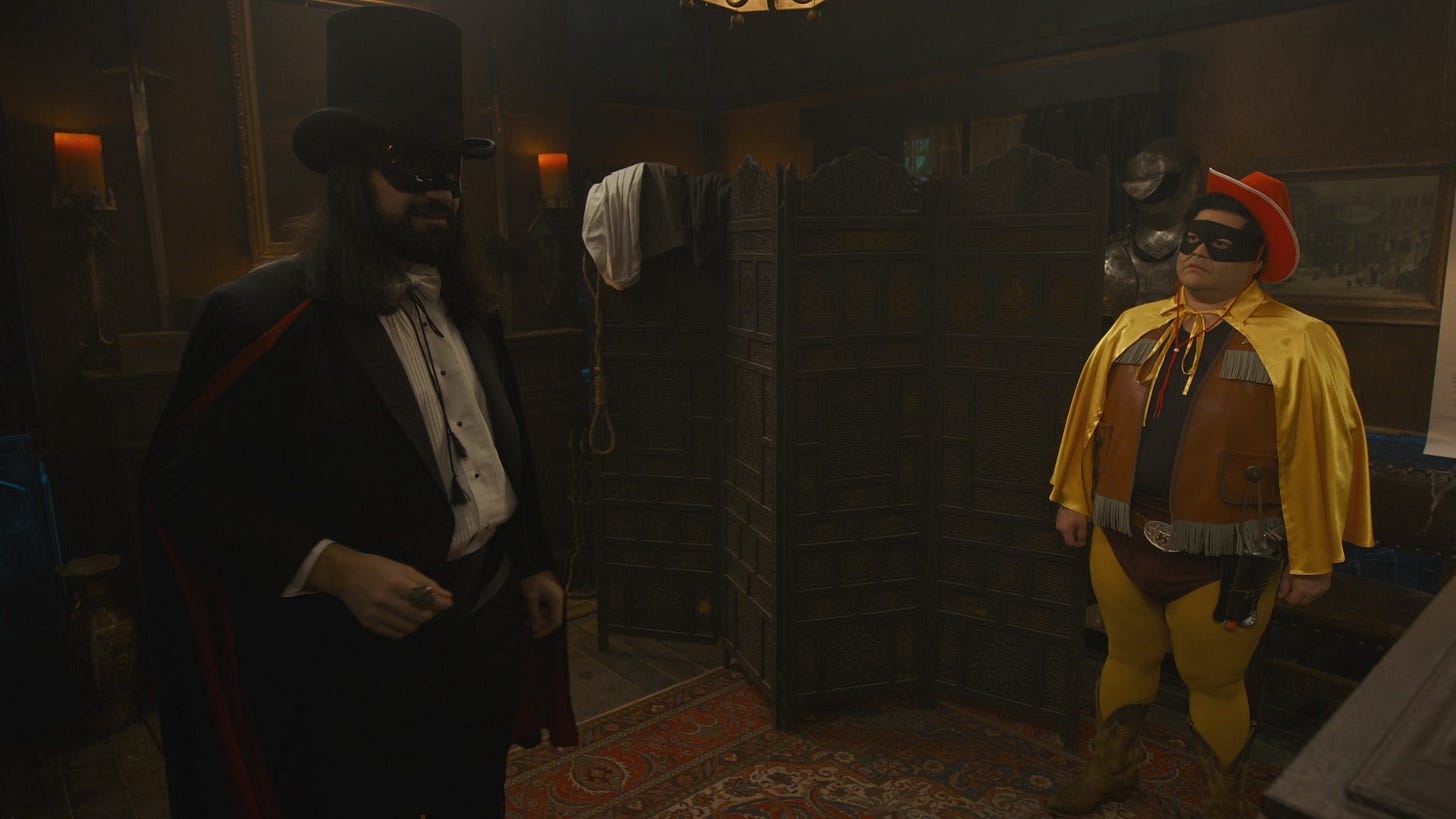 What would’ve most likely been—under normal circumstances—this week’s A-story picks up from Nandor’s big decision last week to use his vampire skills and his newly acquired moral code to fight crime alongside Guillermo. From the start, there are complications: Guillermo hates the skin-tight “Cowboy Kid” costume Nandor has provided for him, and he’s not wild about Nandor’s chosen alias (“The Phantom Menace!”). He’s especially skeptical about Nandor’s poorly-spelled plans for his “Underground Lare,” which will be a thousand feet underneath a secret elevator built into his coffin—after Guillermo helps build it, of course.
