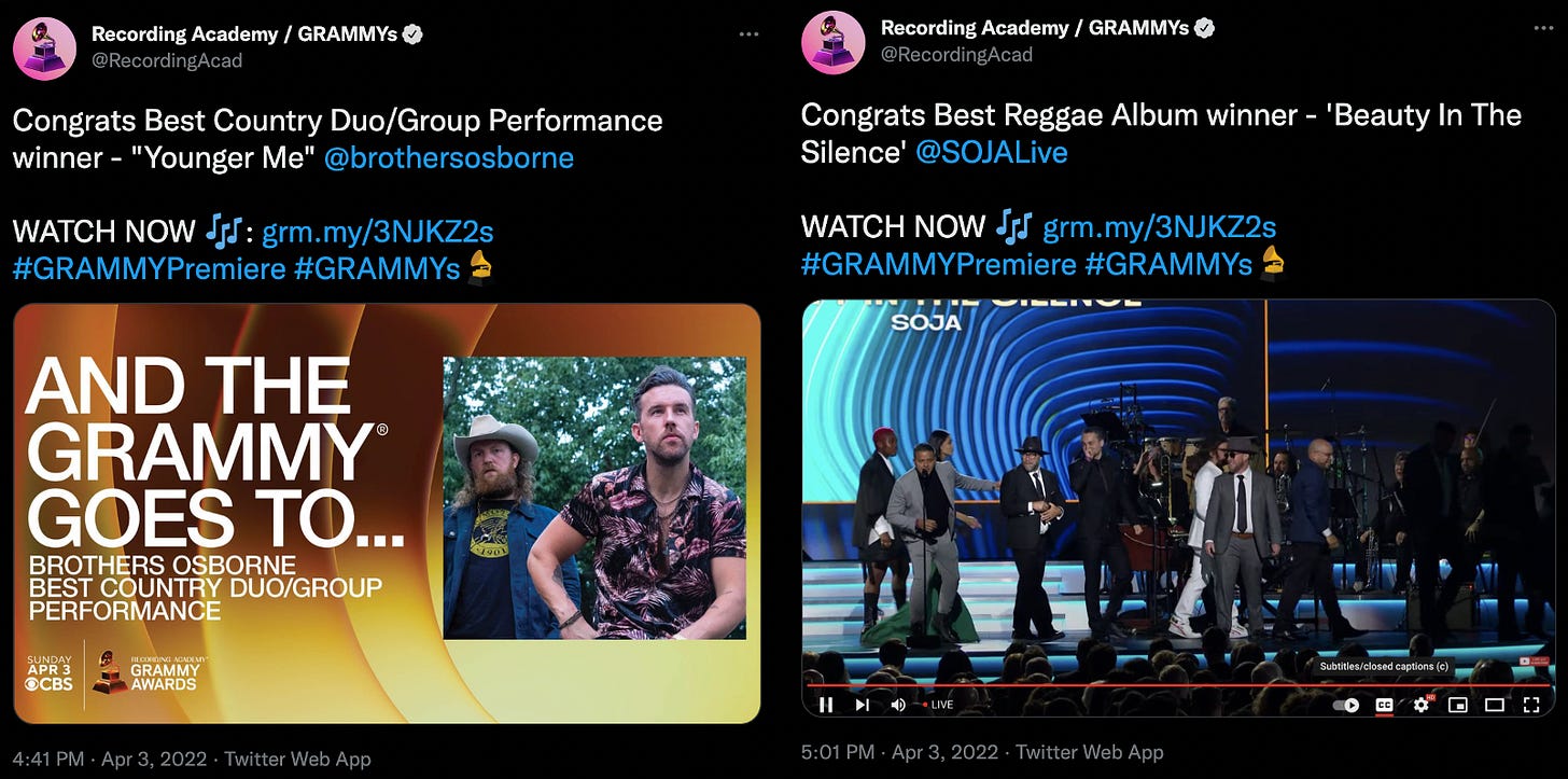 Now that it exists as a YouTube video, there’s a potential for Osborne’s speech to reach a larger audience.3 But weirdly, the Recording Academy didn’t share these videos on Twitter as they were being uploaded. Their social media approach was instead a scattered combination of prepared images (for categories in genres like country that have wide purchase) and what are obviously screenshots of the live feed (for the categories that do not). As a result, it doesn’t feel like these moments are going to live on compared to what the Recording Academy/CBS shared from the main broadcast, aka “the one that matters.”