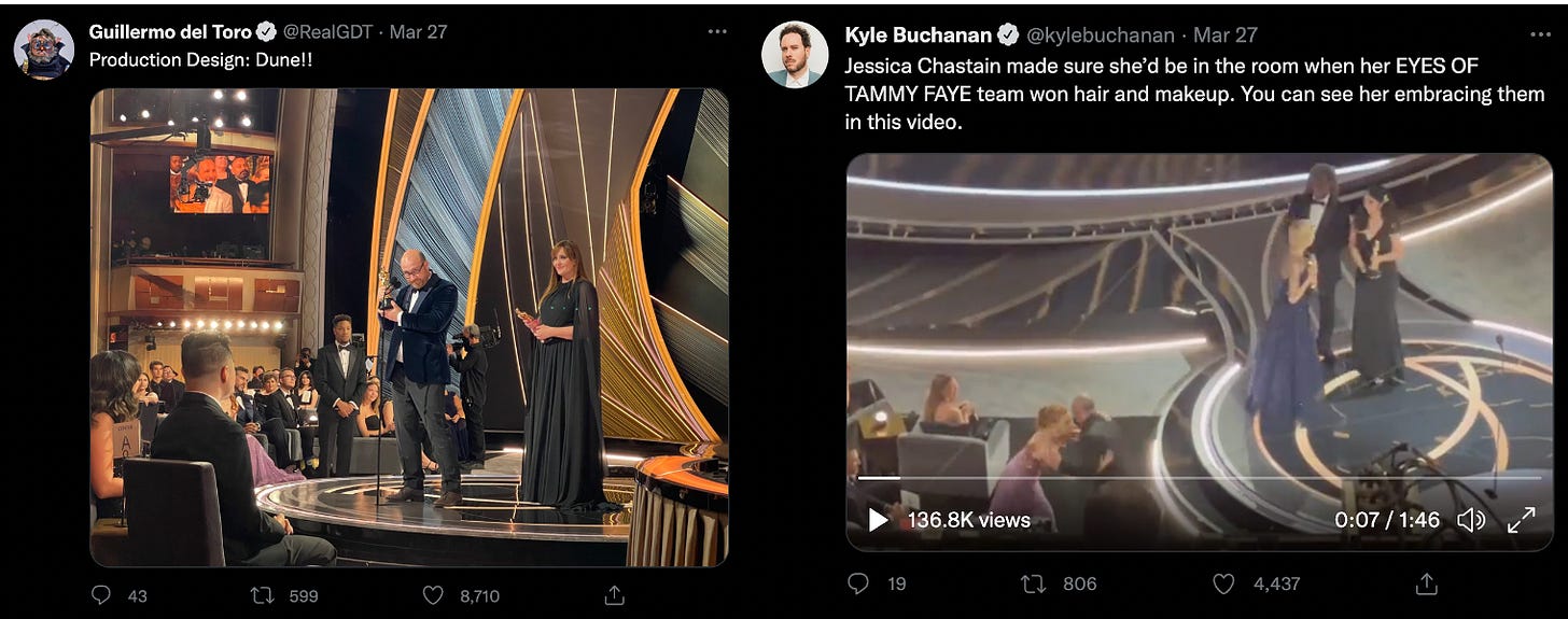Now, this displacement could have been handled much better. The Academy fell behind in livetweeting their own awards, for example, leaving journalists like Kyle Buchanan and nominees like Guillermo Del Toro to effectively do their jobs for them as a corrective to the failure to offer a feed to either journalists (Buchanan was in the audience, not in a press room) or to viewers at home.