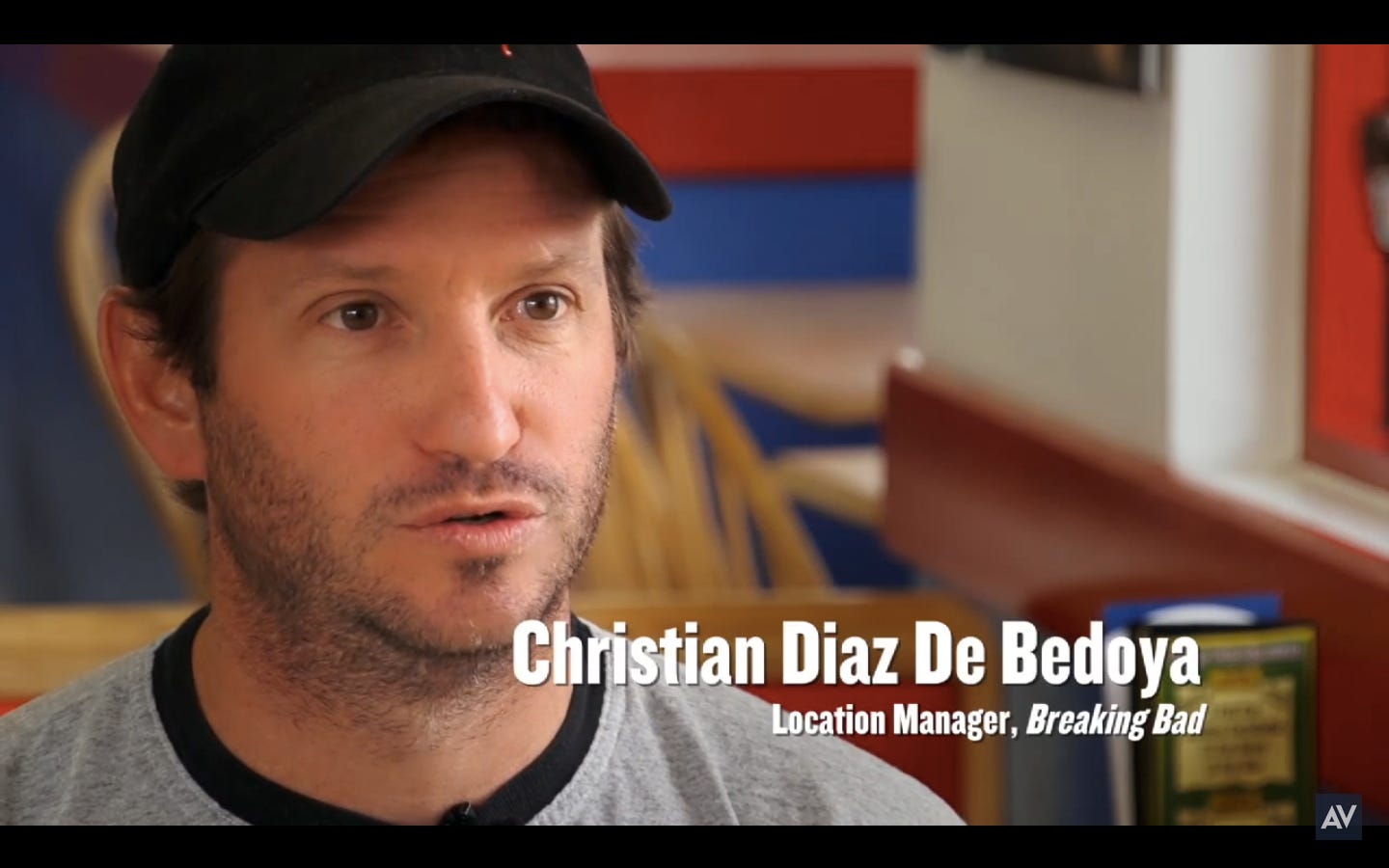 The only space where Diaz De Bedoya was able to speak at length about his role in either series is the aforementioned paratext produced by The A.V. Club, a Pop Pilgrims video where hosts Erik Adams and Emily St. James tour iconic locations from Breaking Bad with Diaz De Bedoya (see Figure 4.3). In the writeup accompanying the 2013 video, Adams notes the credit that Slovis and the show’s directors like Rian Johnson often receive for the series’ visual signature, but argues that “were it not for Diaz De Bedoya, his fellow location managers, and their intimate knowledge of ABQ, Slovis and Johnson would be shooting against a less idiosyncratic canvas.” It is one of the rare instances where Diaz De Bedoya gets to speak to his role in the series at length, and in the video, he gets to—for the first time—be the one to make the all-important claim that Albuquerque is, indeed “a character in the show” as the person most directly responsible for ensuring the show has access to the locations that make that possible.