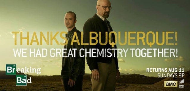 When AMC drama series Breaking Bad began the final episodes of its five-season run in the summer of 2013, the channel and the series’ producer Sony Pictures Television purchased several billboards commemorating the occasion. However, these billboards did not go up in Los Angeles or New York City to promote the series to the largest possible audience: they went up in Albuquerque, New Mexico, where the series was set and shot. Featuring an image of series stars Bryan Cranston and Aaron Paul, who played meth producers Walter White and Jesse Pinkman respectively, information about the series’ return date and timeslot were placed in small font in the bottom right corner of the image. In the middle of the image, meanwhile, was a direct message to the city itself: “Thanks Albuquerque! We had great chemistry together!”