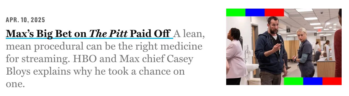 That being said, I had a conversation with fellow media scholar and Friend of the Newsletter Michael Z. Newman recently which seemed like a valuable subject for a dialogue about how we’re thinking about the narrative structure of this alleged “throwback.” Specifically, we talked after a Vulture newsletter by another Friend of the Newsletter Josef Adalian framed The Pitt as a procedural alongside an interview where HBO head Casey Bloys does the same. Michael’s message to me was effectively a simple question: why are they talking about The Pitt as a procedural when it clearly isn’t one?
