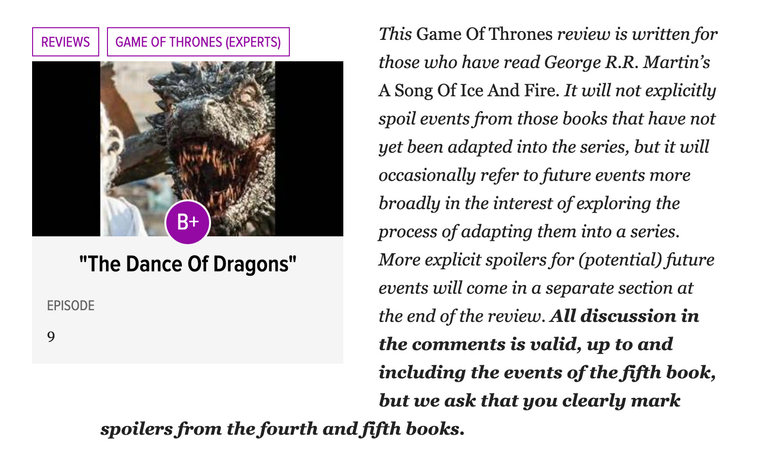 Earlier this summer, Polygon asked me to write a preview of House of the Dragon helping non-readers prepare for its debut, and I understood why: although I had written reviews that straddled the line between a reader and non-reader perspective for the first four seasons, in the fifth season I took over the “Experts” reviews at The A.V. Club from Emily St. James. That distinction between “Newbies” and “Experts” grew silly once the show progressed beyond Martin’s published books, but it stuck around because it was inherent to how distinct the show was from the very beginning. Here was an adaptation where the source material had so many significant twists and so much expected diversion based on the shift to a new medium that two different reviewers were required to reflect viewers’ own relationship to the show.