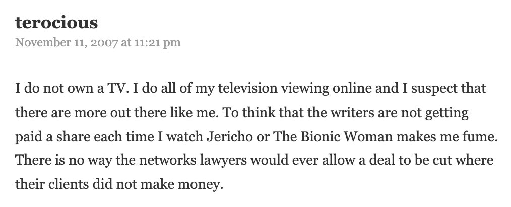 I have to leave you with this comment, the only one left on my 2007 post about the writer’s strike, because the phrase “To think that the writers are not getting paid a share each time I watch Jericho or The Bionic Woman makes me fume” is just the most precious time capsule.